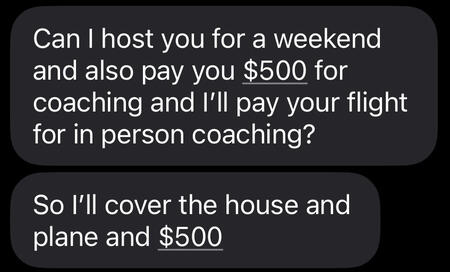 $500 per day + flights, for hands on, all day access to 1 on 1 coaching/going out with me.Text Message Access To Me