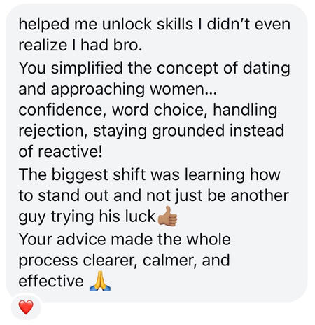 10,000 approaches. No gimmicks. Real results. Real Receipts. I’ve done it broke. I’ve done it sober.Choose yourself, become your most attractive self, unlock your God given personality and confidence today.